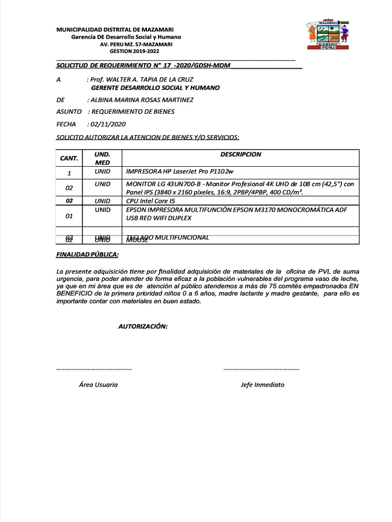REQUERIMIE NTO N° 17 -2020/GDSH-MDM _________