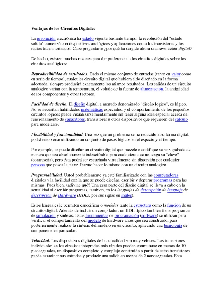 con dispositivos analgicos y aplicaciones como los transistores y los radios transistorizados. Cabe preguntarse por qu ha surgido ahora una revolucin digital? De hecho, existen muchas razones para dar preferencia a los circuitos digitales sobre los circuitos analgicos: Reproducibilidad de resultados. Dado el mismo conjunto de entradas (tanto en valor como en serie de tiempo), cualquier circuito digital que hubiera sido diseado en la forma adecuada, siempre producir exactamente los mismos resultados. Las salidas de un circuito analgico varan con la temperatura, el voltaje de la fuente de alimentacin, la antigedad de los componentes y otros factores. Facilidad de diseo. El diseo digital, a menudo denominado "diseo lgico", es lgico. No se necesitan habilidades matemticas especiales, y el comportamiento de los pequeos circuitos lgicos puede visualizarse mentalmente sin tener alguna idea especial acerca del funcionamiento de capacitores, transistores u otros dispositivos que requieren del clculo para modelarse. Flexibilidad y funcionalidad. Una vez que un problema se ha reducido a su forma digital, podr resolverse utilizando un conjunto de pasos lgicos en el espacio y el tiempo. Por ejemplo, se puede disear un circuito digital que mezcle o codifique su voz grabada de manera que sea absolutamente indescifrable para cualquiera que no tenga su "clave" (contrasea), pero sta podr ser escuchada virtualmente sin distorsin por cualquier persona que posea la clave. Intente hacer lo mismo con un circuito analgico. Programabilidad. Usted probablemente ya est familiarizado con las computadoras digitales y la facilidad con la que se puede disear, escribir y depurar programas para las mismas. Pues bien, adivine qu? Una gran parte del diseo digital se lleva a cabo en la actualidad al escribir programas, tambin, en los lenguajes de descripcin de lenguaje de descripcin de Hardware (HDLs, por sus siglas en ingls), Estos lenguajes le permiten especificar o modelar tanto la estructura como la funcin de un circuito digital. Adems de incluir un compilador, un HDL tpico tambin tiene programas de simulacin y sntesis. Estas herramientas de programacin (software) se utilizan para verificar el comportamiento del modelo de hardware antes que sea construido, para posteriormente realizar la sntesis del modelo en un circuito, aplicando una tecnologa de componente en particular. Velocidad. Los dispositivos digitales de la actualidad son muy veloces. Los transistores individuales en los circuitos integrados ms rpidos pueden conmutarse en menos de 10 picosegundos, un dispositivo completo y complejo construido a partir de estos transistores puede examinar sus entradas y producir una salida en menos de 2 nanosegundos. Esto