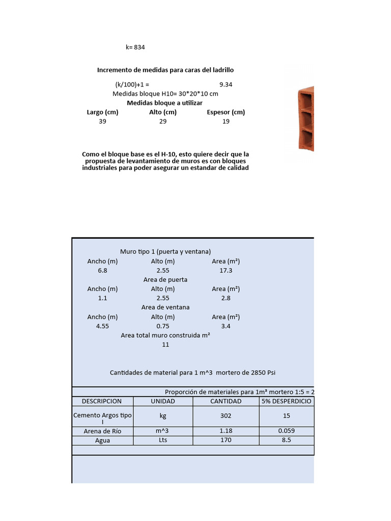 rtero 1:5 = 2850 Psi Resistencia del mortero a utilizar