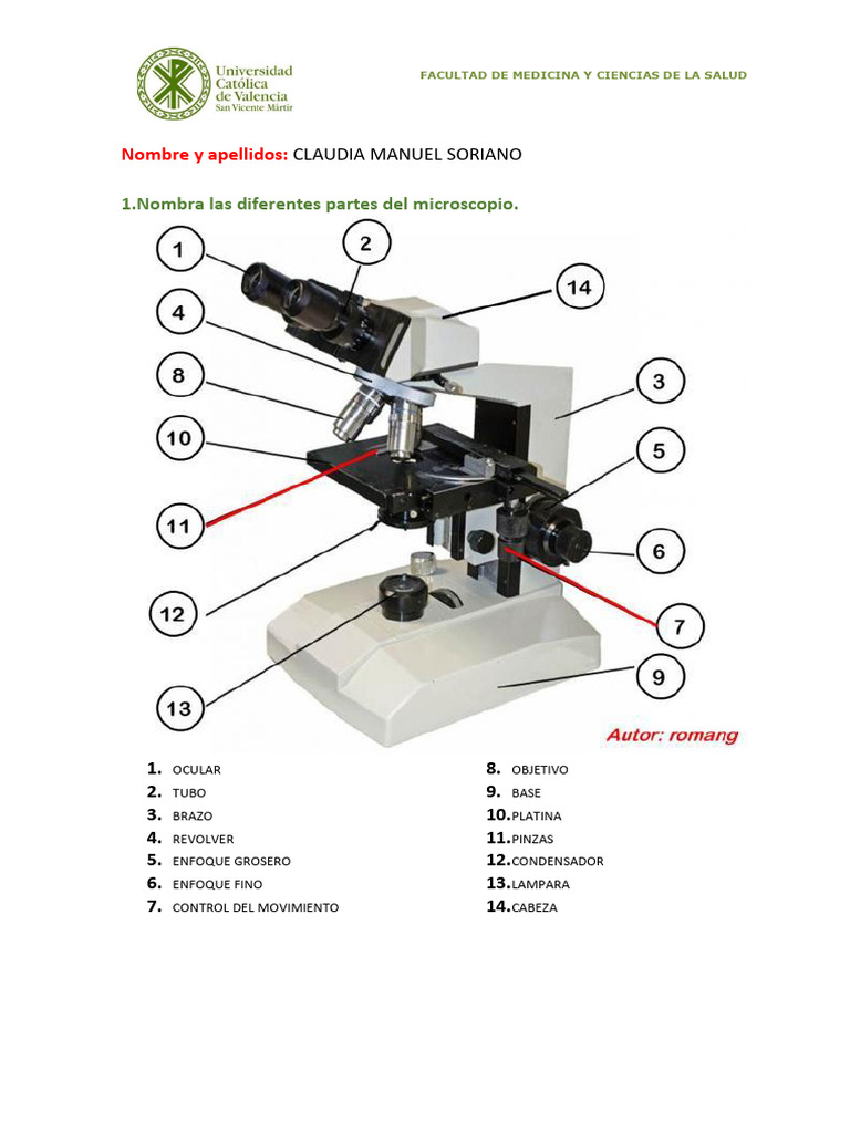 1.Nombra las diferentes partes del microscopio.