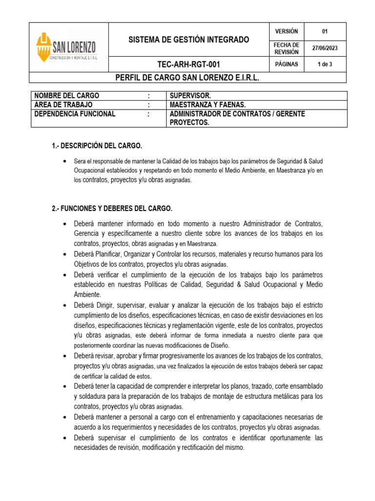 PERFIL DE CARGO SAN LORENZO E.I.R.L.