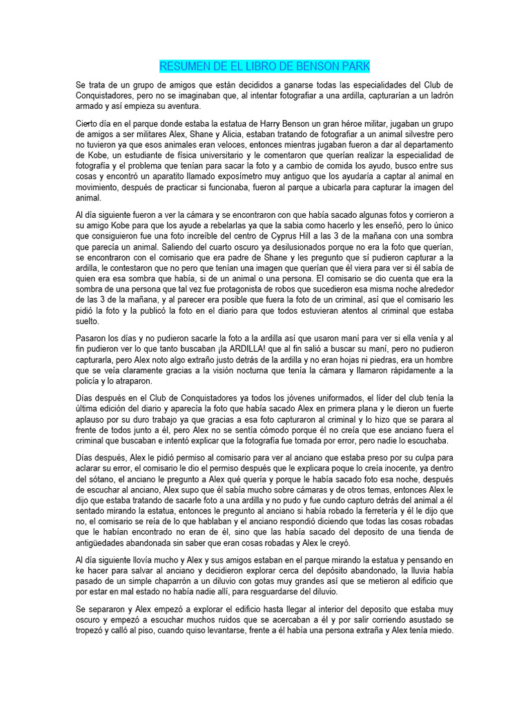 RESUMEN DE EL LIBRO DE BENSON PARK