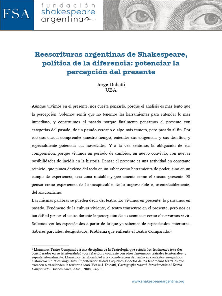del siglo XX, Buenos Aires, Editorial de Belgrano, 1998, pp. 423-439; “Shakespeare, ¿nuestro