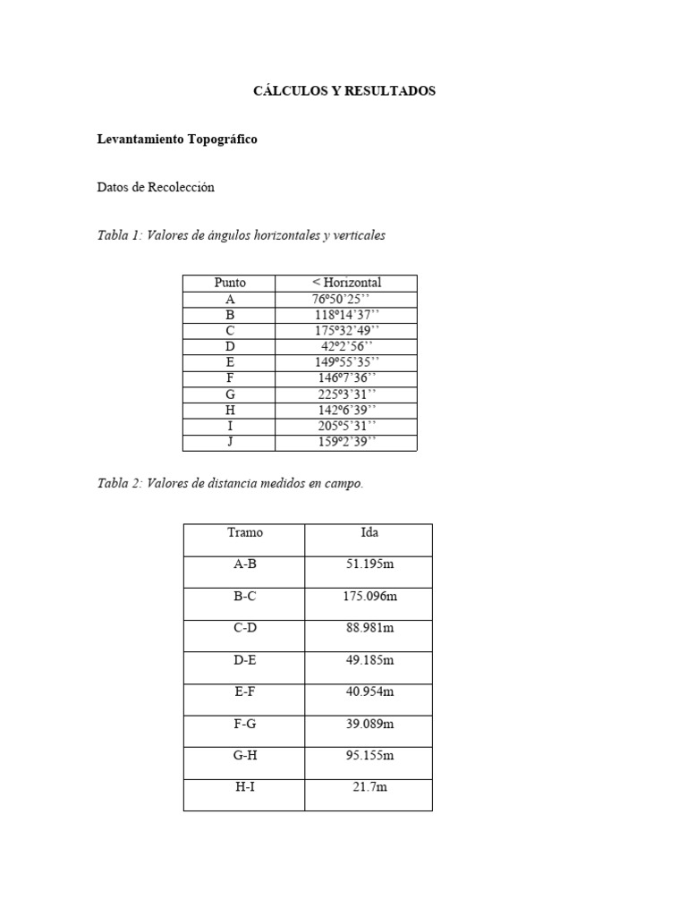 Tabla 1: Valores de ángulos horizontales y verticales