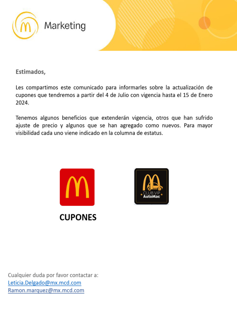 CUPONES ALWAYS ON Y WHATSAPP BOT DE McDONALD´s FECHA PRECIO ACTUAL PRECIO CUPÓN ESTATUS PLATAFORMA