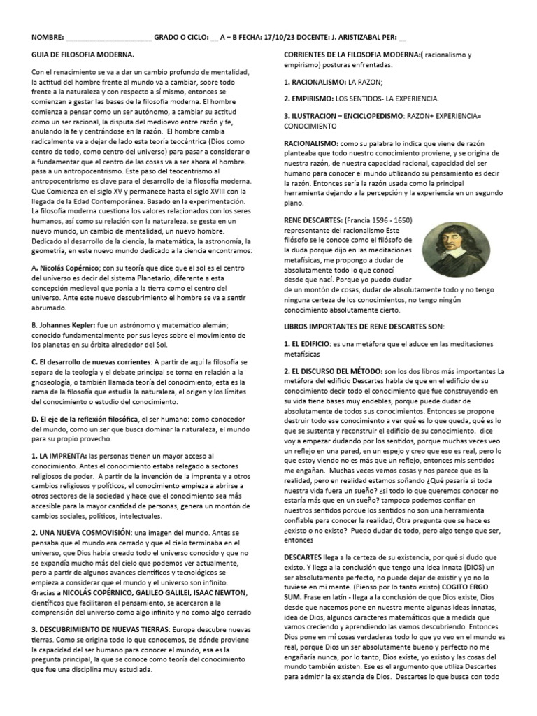GUIA DE FILOSOFIA MODERNA. CORRIENTES DE LA FILOSOFIA MODERNA:( racionalismo y