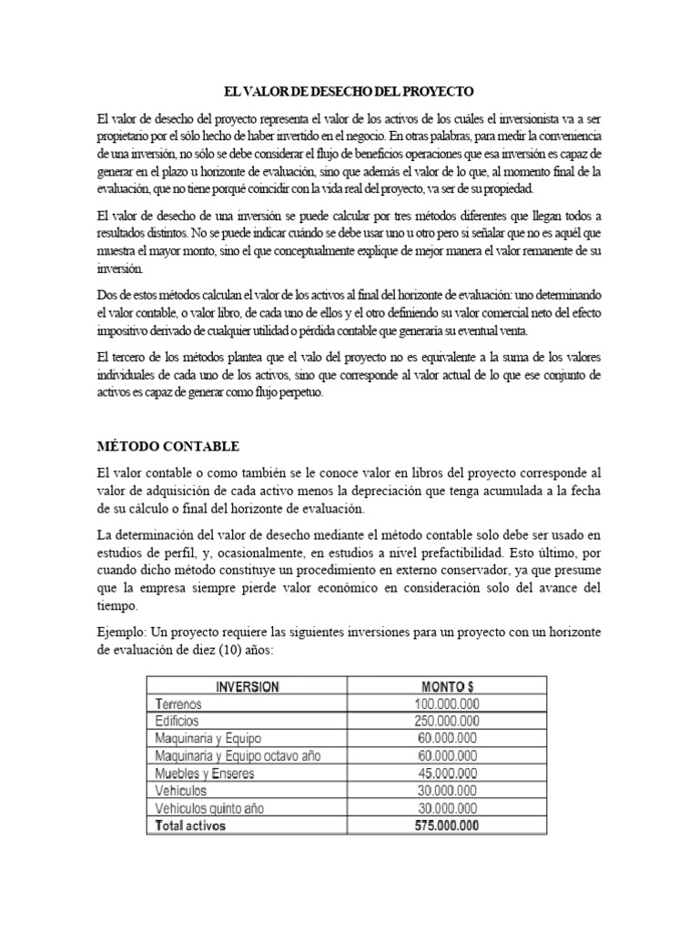 desecho de un proyecto de inversión será la suma de los valores de mercado que sería