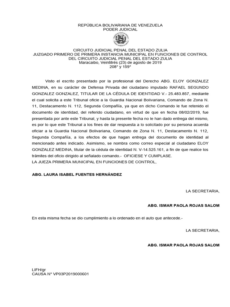 Maracaibo, Veintitrés (23) de agosto de 2019