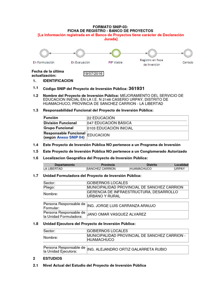 2.1 Nivel Actual del Estudio del Proyecto de Inversión Pública
