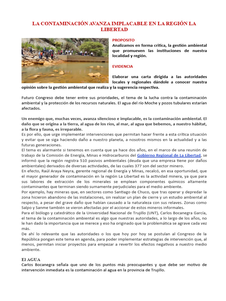 intervención inmediata es la contaminación al agua en la provincia de Trujillo.