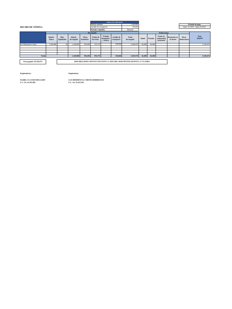RECIBO DE NÓMINA Auxilio de transporte 140,606 Junio 01 2023 - Junio 30 2023