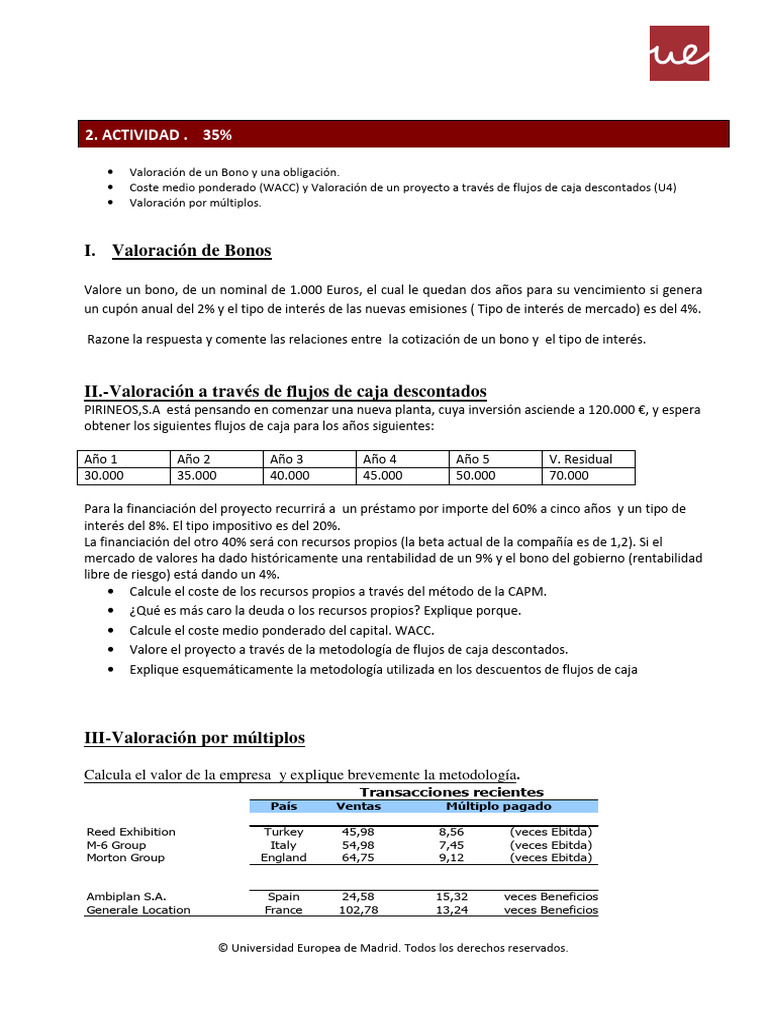 • Coste medio ponderado (WACC) y Valoración de un proyecto a través de flujos de caja descontados (U4)