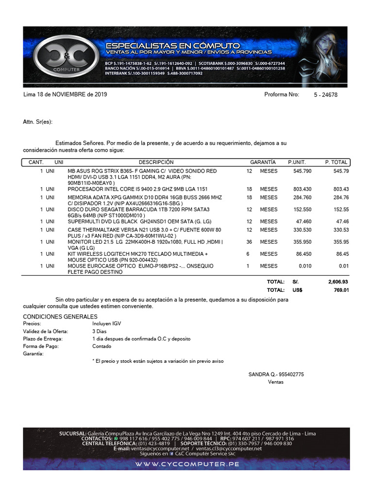 Lima 18 de NOVIEMBRE de 2019 Proforma Nro: 5 - 24678