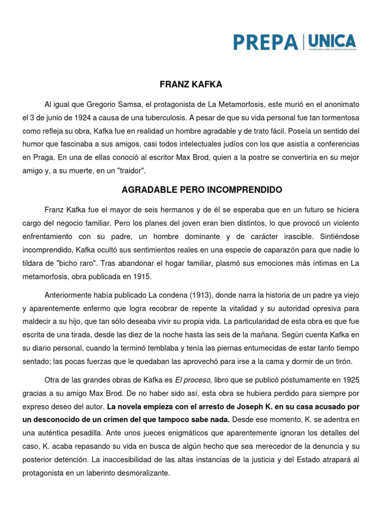 gracias a su amigo Max Brod. De no haber sido así, esta obra se hubiera perdido para siempre por