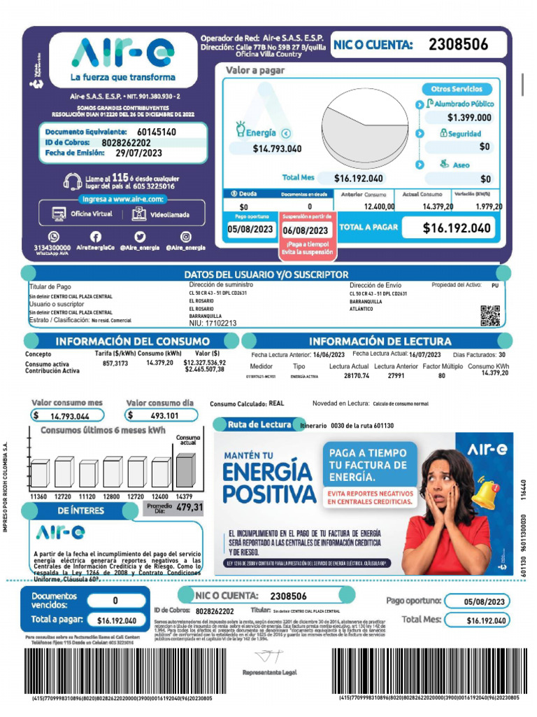 Generación: 344,7745 Circuito / Transformador: 0113-PORTAL DEL PRADO Para pago en cheque gírese a Fiduoccidente Air-e SAS ESP NIT 830054076