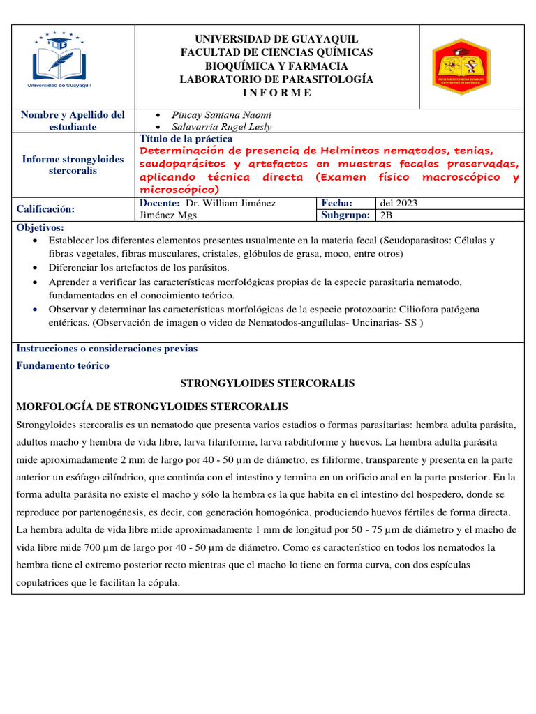 Informe strongyloides seudoparásitos y artefactos en muestras fecales preservadas,