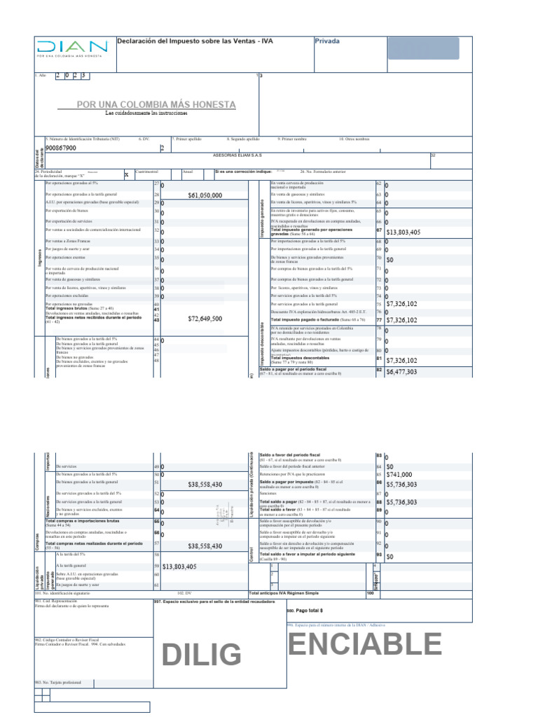 77. Total impuesto pagado o facturado: es el resultado de sumar los valores registrados en las inmediatamente anterior, o los ingresos brutos de dicho año sean superiores a cien mil UVT (100.000). También se requiere la firma