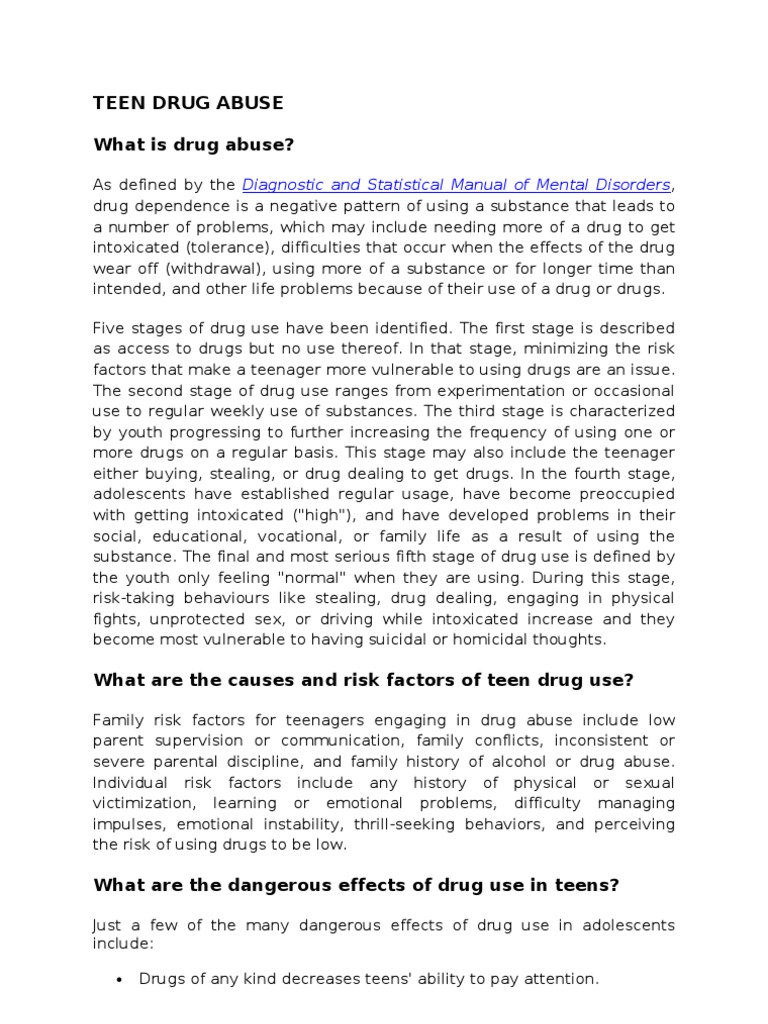 As defined by the Diagnostic and Statistical Manual of Mental Disorders, drug dependence is a negative pattern of using a substance that leads to a number of problems, which may include needing more of a drug to get intoxicated (tolerance), difficulties that occur when the effects of the drug wear off (withdrawal), using more of a substance or for longer time than intended, and other life problems because of their use of a drug or drugs. Five stages of drug use have been identified. The first stage is described as access to drugs but no use thereof. In that stage, minimizing the risk factors that make a teenager more vulnerable to using drugs are an issue. The second stage of drug use ranges from experimentation or occasional use to regular weekly use of substances. The third stage is characterized by youth progressing to further increasing the frequency of using one or more drugs on a regular basis. This stage may also include the teenager either buying, stealing, or drug dealing to get drugs. In the fourth stage, adolescents have established regular usage, have become preoccupied with getting intoxicated ("high"), and have developed problems in their social, educational, vocational, or family life as a result of using the substance. The final and most serious fifth stage of drug use is defined by the youth only feeling "normal" when they are using. During this stage, risk-taking behaviours like stealing, drug dealing, engaging in physical fights, unprotected sex, or driving while intoxicated increase and they become most vulnerable to having suicidal or homicidal thoughts.
