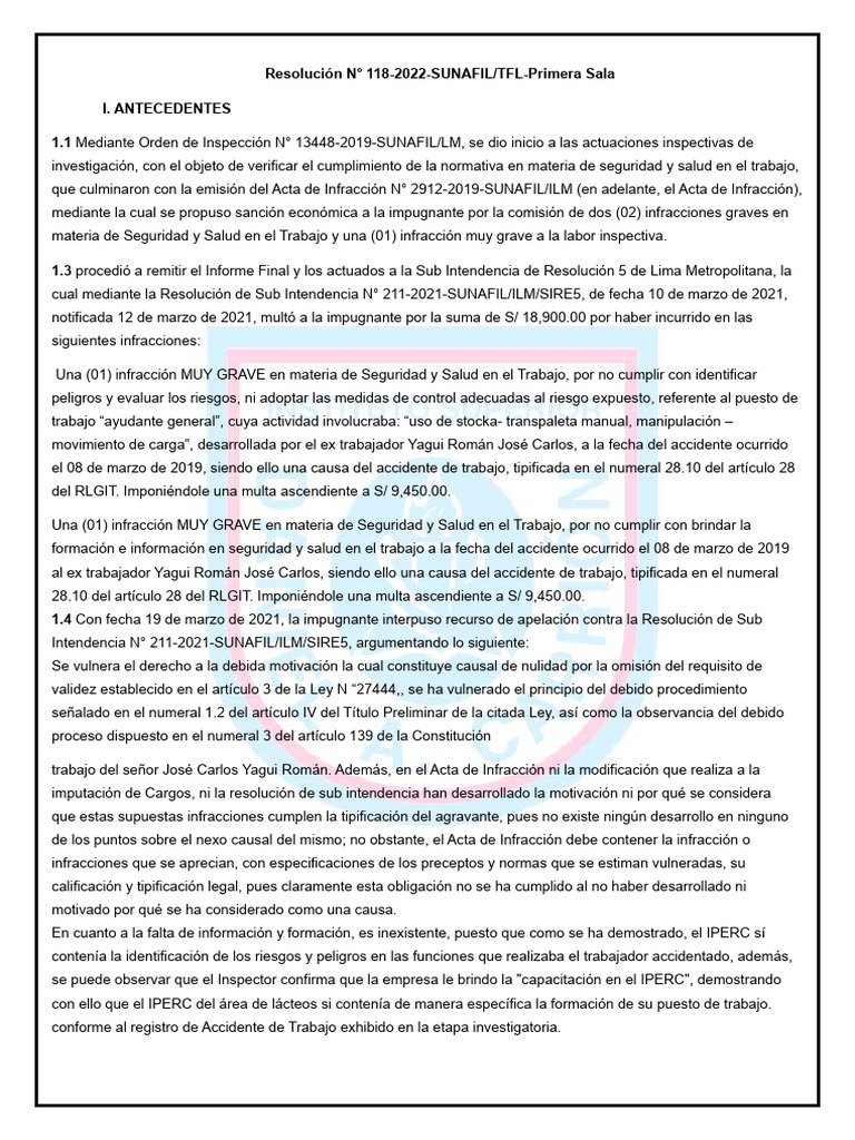 Resolución N° 118-2022-SUNAFIL/TFL-Primera Sala