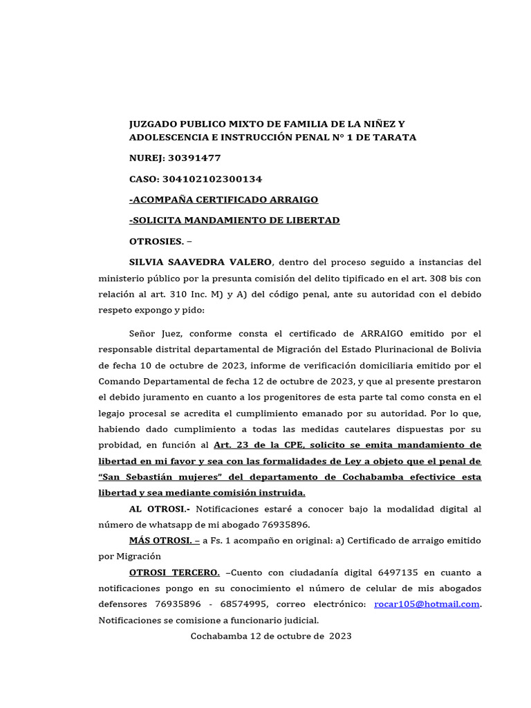 Señ or Juez, conforme consta el certificado de ARRAIGO emitido por el