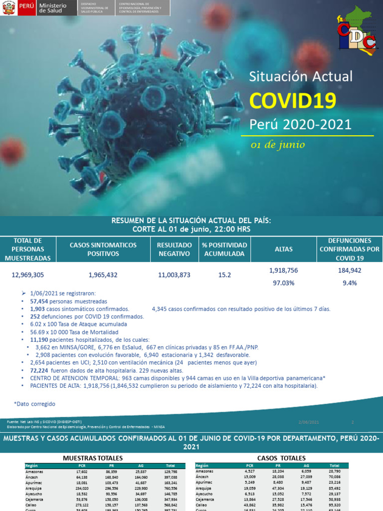 MUESTRAS Y CASOS CONFIRMADOS REPORTADOS EL 01 DE JUNIO DE COVID-19 POR DEPARTAMENTO, PERÚ 2020-