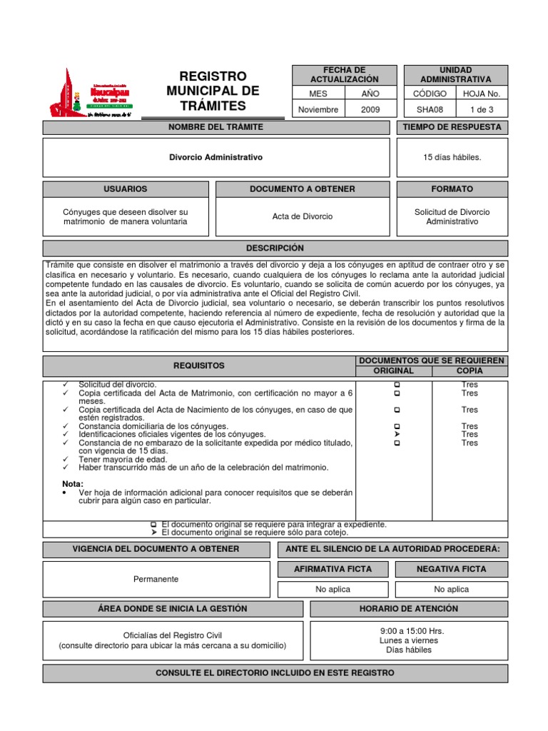 Oficiala del Registro Civil de la Secretara del H. Ayuntamiento SHA08 COSTO 20.92 salarios mnimos por divorcio administrativo 1.3 salarios mnimos por anotacin marginal al Acta de Matrimonio 3.711 salarios mnimos asentamiento del Acta de Divorcio REA DE PAGO Caja del Registro Civil, dependiente de Tesorera y Finanzas