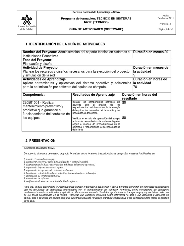 1. IDENTIFICACIN DE LA GUA DE ACTIVIDADES Nombre del Proyecto: Administracin del soporte tcnico en sistemas a Instituciones Educativas Fase del Proyecto: Planeacin y diseo Actividad de Proyecto Planear los recursos y diseos necesarios para la ejecucin del proyecto y simulacin de la red Actividades de Aprendizaje Aplicar herramientas y aplicativos del sistema operativo y adicionales para la optimizacin por software del equipo de cmputo. Competencia: 220501001 - Realizar mantenimiento preventivo y predictivo que garantice el funcionamiento del hardware de los equipos. Resultados de Aprendizaje