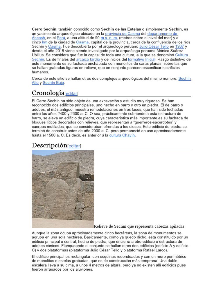 Sechín y Casma. Fue descubierta por el arqueólogo peruano Julio César Tello en 1937 y
