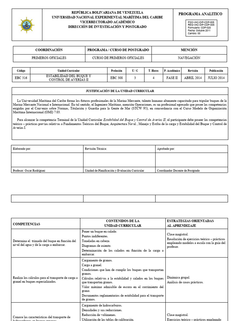 Para alcanzar la competencia Terminal de la Unidad Curricular Estabilidad del Buque y Control de Averías II, el participante debe poseer las competencias
