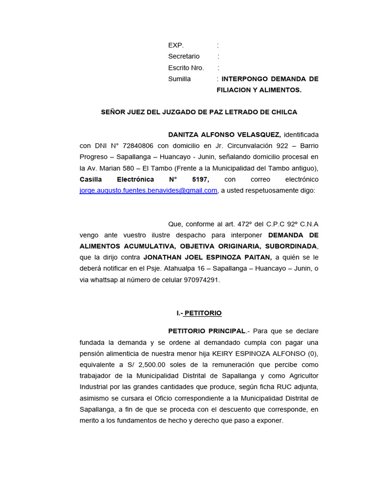 Progreso – Sapallanga – Huancayo - Junin, señalando domicilio procesal en
