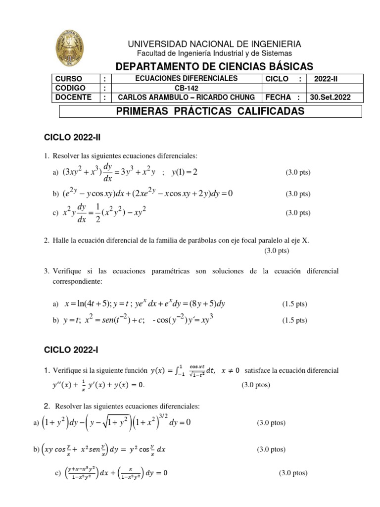 b) (𝑥𝑦 𝑐𝑜𝑠 𝑥 + 𝑥 2 𝑠𝑒𝑛 𝑥 ) 𝑑𝑦 = 𝑦 2 cos 𝑥 𝑑𝑥 (3.0 ptos)