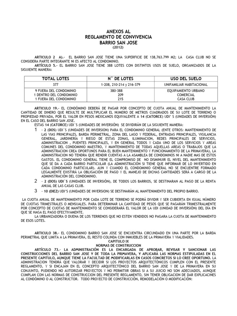ARTÍCULO 74.- PARA TODAS LAS ÁREAS PRIVATIVAS O LOTES DE TERRENOS DEL BARRIO SAN JOSE EXISTEN CIERTAS