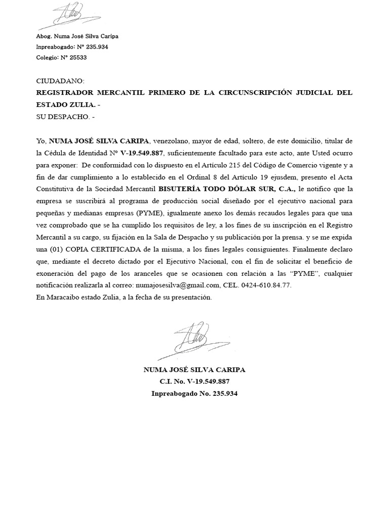 Constitutiva de la Sociedad Mercantil BISUTERÍA TODO DÓLAR SUR, C.A., le notifico que la