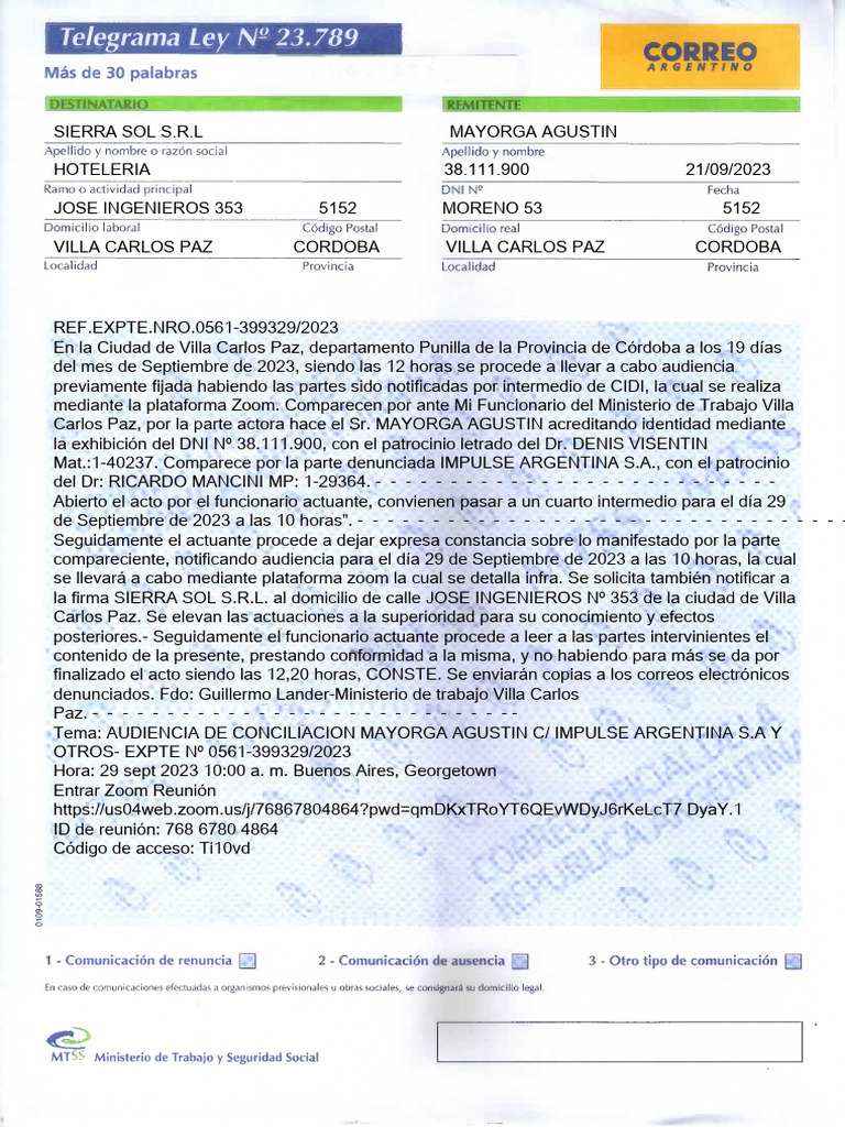 Tema: AUDIENCIA DE CONCILIACION MAYORGA AGUSTIN C/ IMPULSE ARGENTINA S.A Y