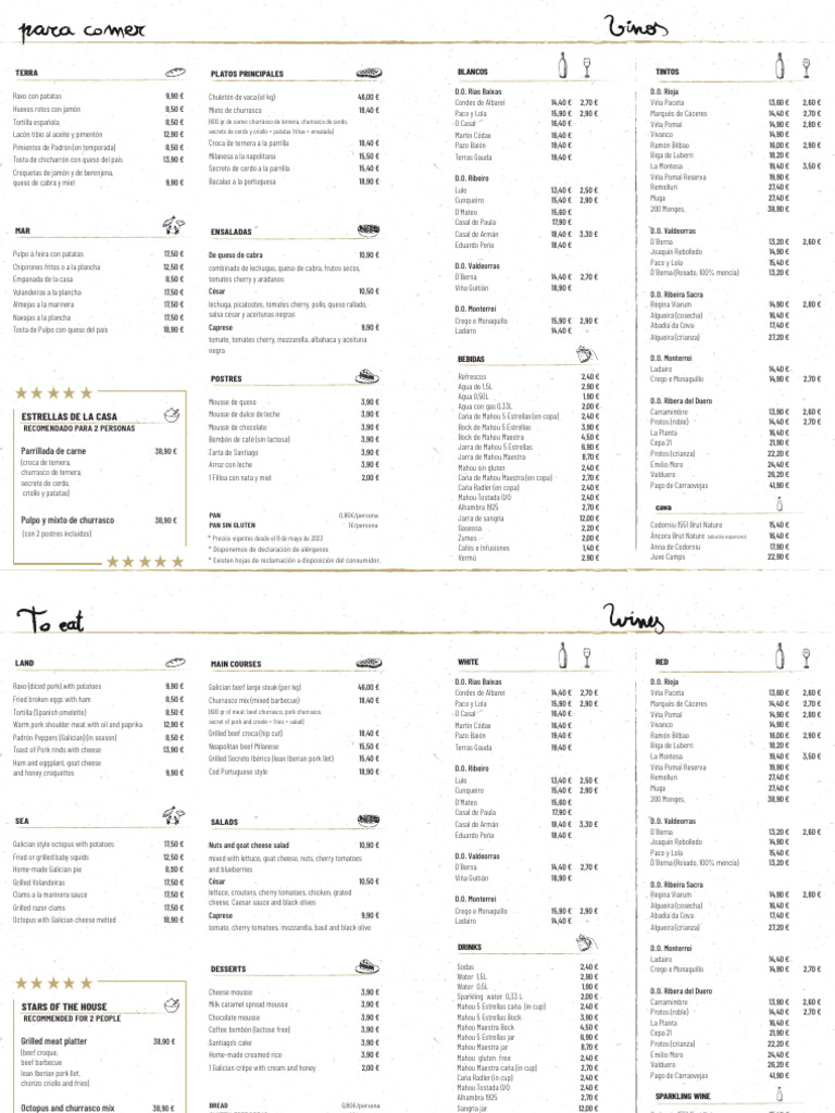 Fried broken eggs with ham 8,50 € Churrasco mix (mixed barbecue) 18,40 € Paco y Lola 15,90 € 2,90 € Marqués de Cáceres 14,40 € 2,70 €