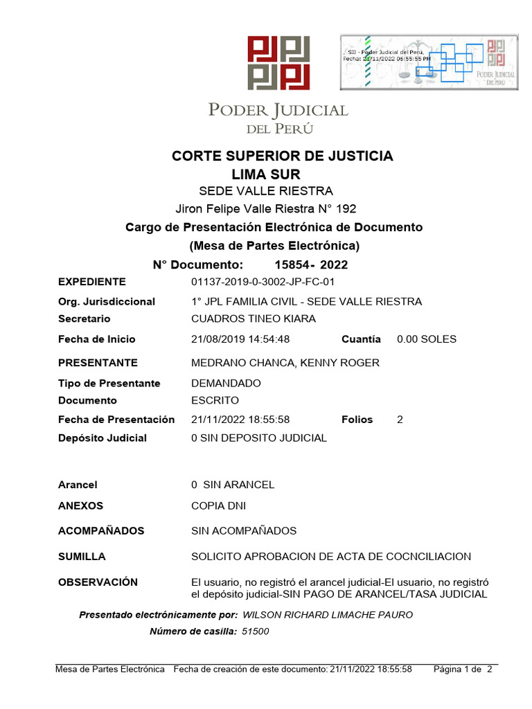 Mesa de Partes Electrónica Fecha de creación de este documento: 21/11/2022 18:55:58 Página 1 de 2