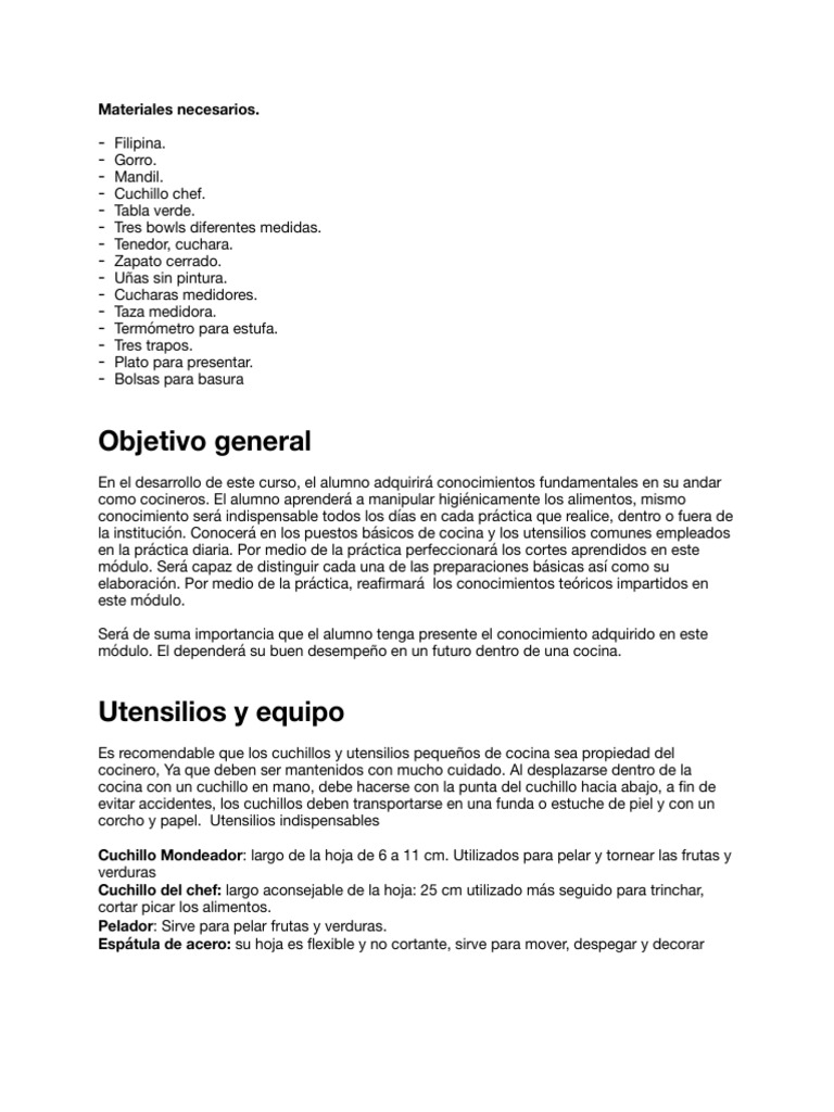 la institución. Conocerá en los puestos básicos de cocina y los utensilios comunes empleados