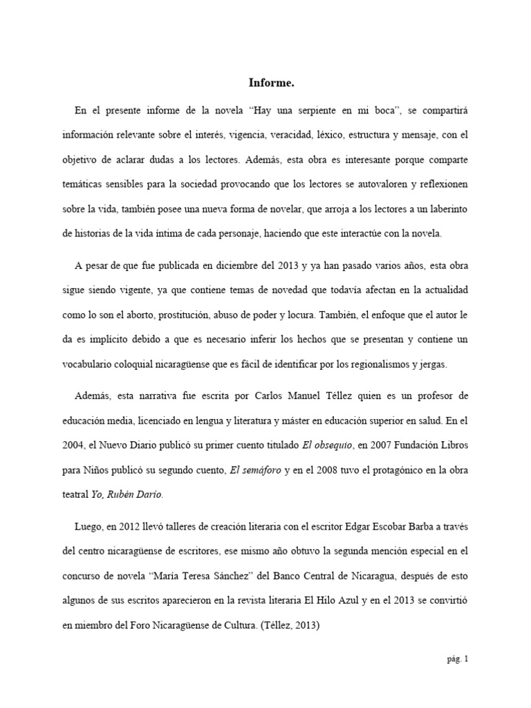 En el presente informe de la novela “Hay una serpiente en mi boca”, se compartirá