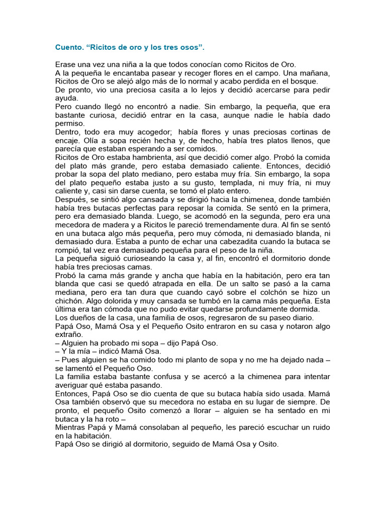 Cuento. “Ricitos de oro y los tres osos”.
