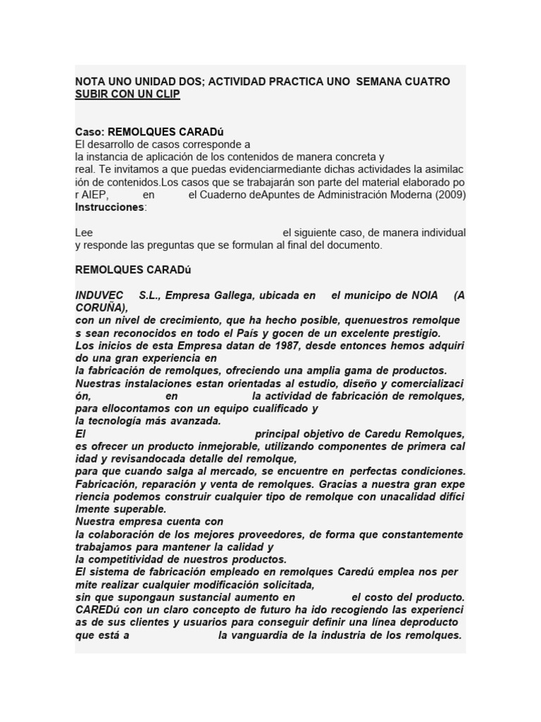 NOTA UNO UNIDAD DOS; ACTIVIDAD PRACTICA UNO SEMANA CUATRO