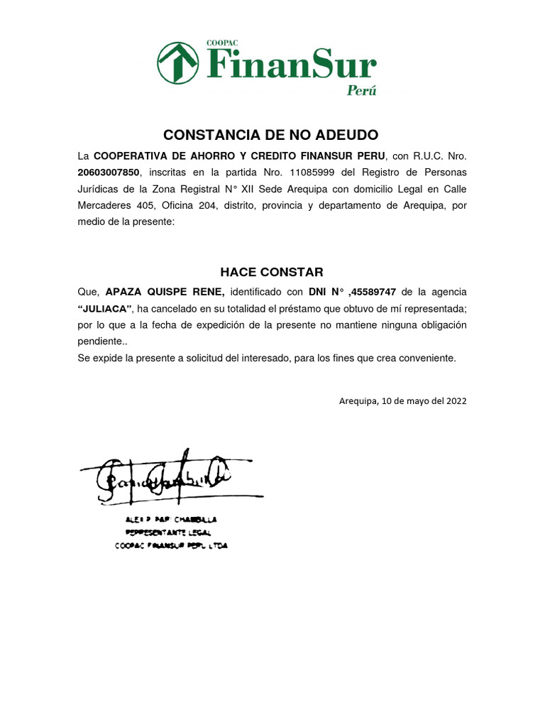 “JULIACA”, ha cancelado en su totalidad el préstamo que obtuvo de mí representada;