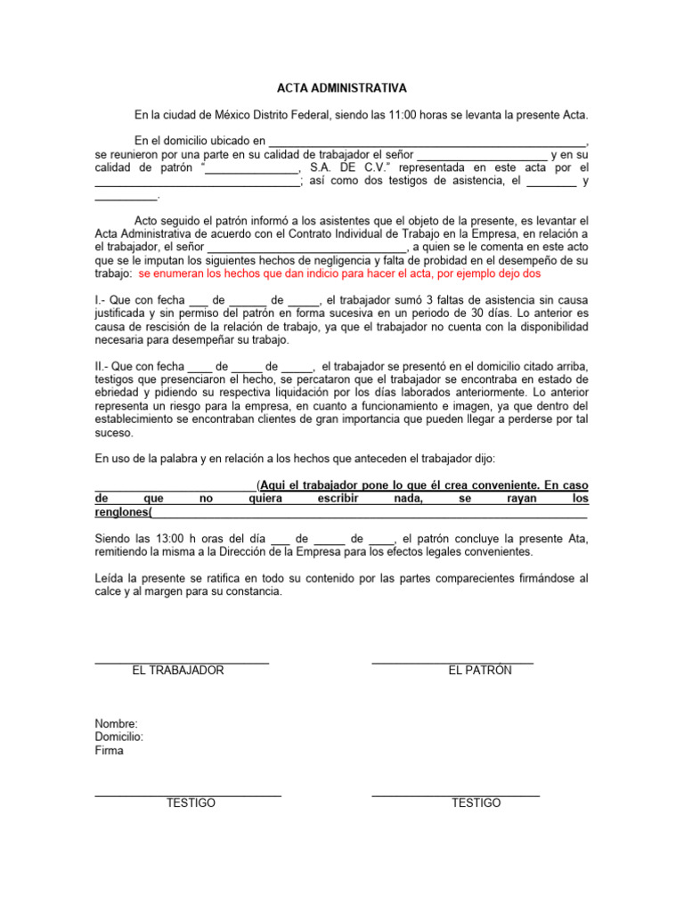 Acta Administrativa de acuerdo con el Contrato Individual de Trabajo en la Empresa, en relación a