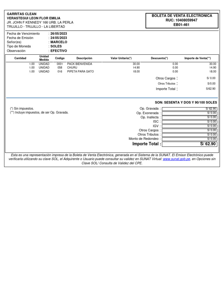 Esta es una representación impresa de la Boleta de Venta Electrónica, generada en el Sistema de la SUNAT. El Emisor Electrónico puede