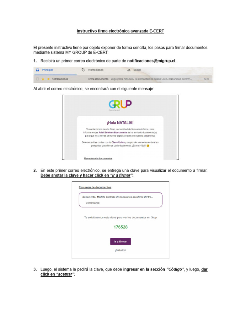 2. En este primer correo electrónico, se entrega una clave para visualizar el documento a firmar.