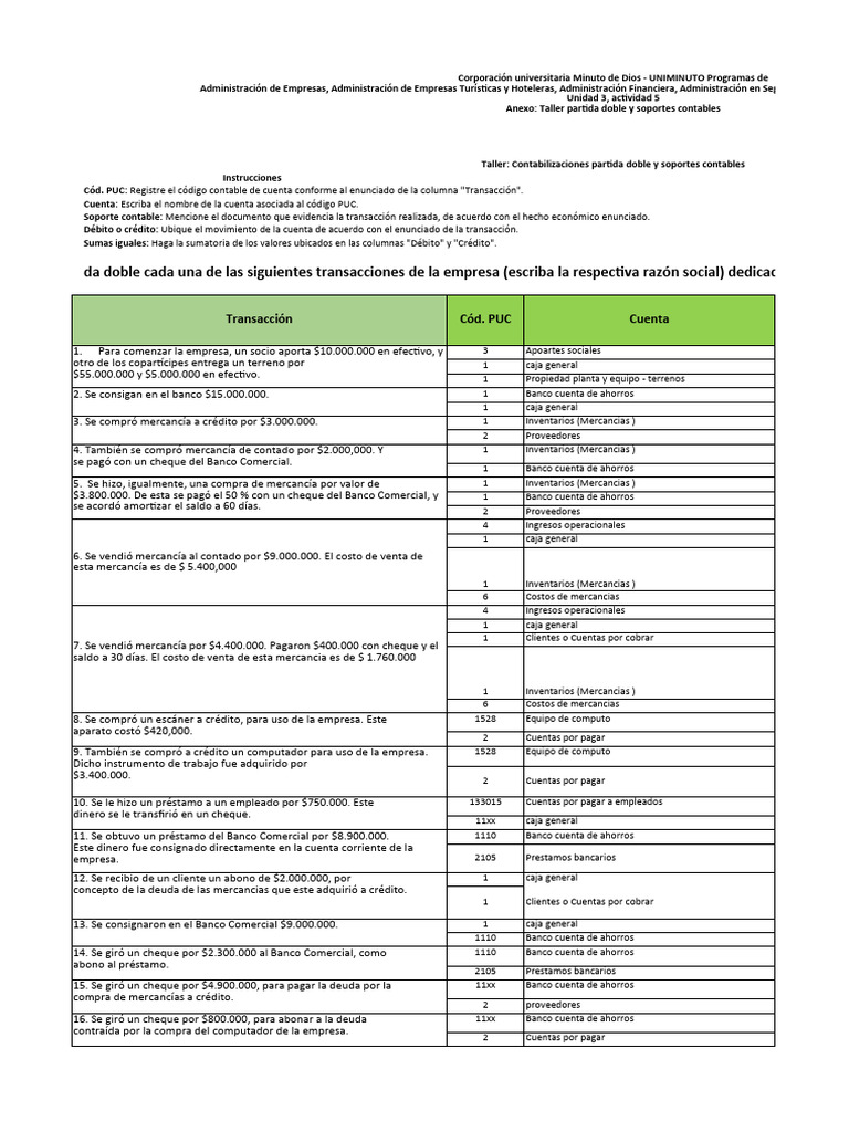 Cód. PUC: Registre el código contable de cuenta conforme al enunciado de la columna "Transacción".