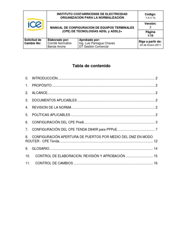 MANUAL DE CONFIGURACIN DE EQUIPOS TERMINALES (CPE) DE TECNOLOGAS ADSL y ADSL2+ Solicitud de Cambio No: Elaborado por: Comit Normativo Banda Ancha Aprobado por: Ing. Luis Paniagua Chaves DT Gestin Comercial