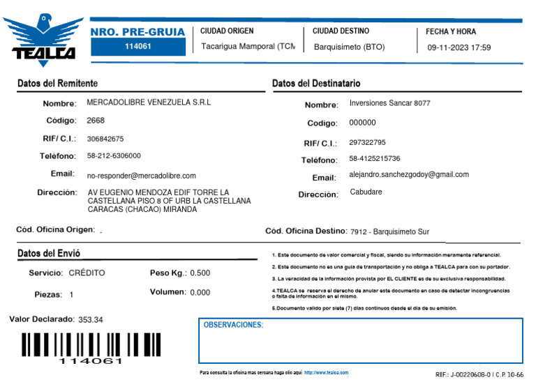 Cód. Oficina Origen: - Cód. Oficina Destino: 7912 - Barquisimeto Sur