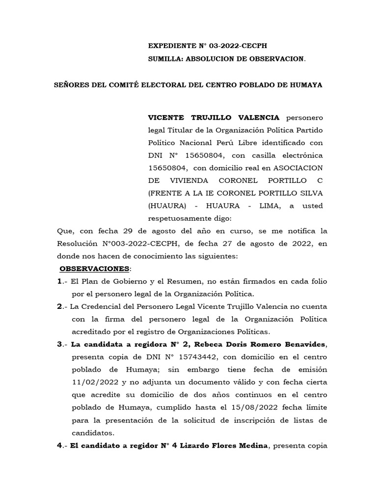 comité electoral ha señalado la subsanación de la observación en