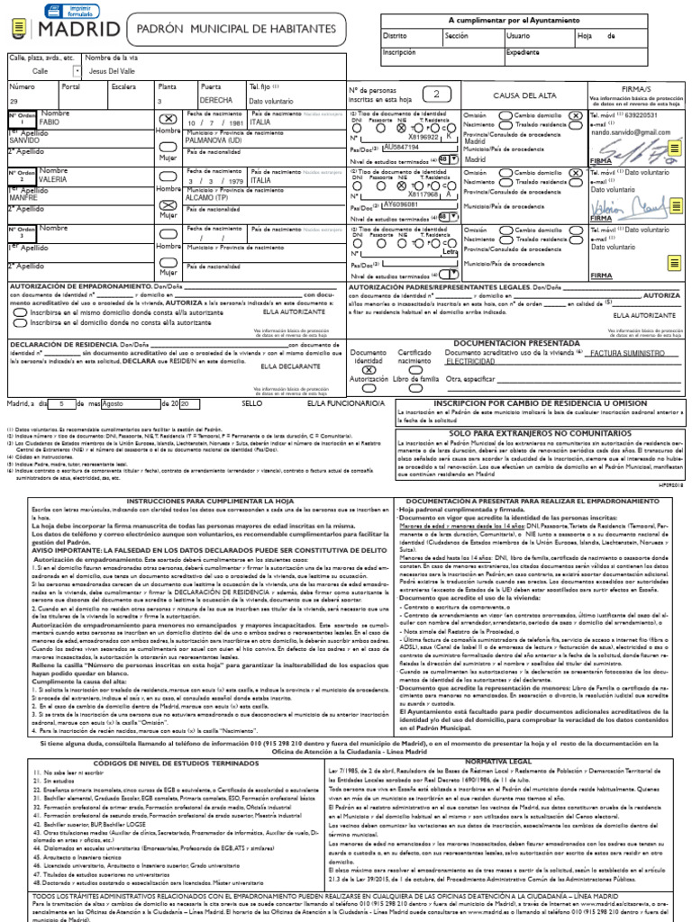 Madrid, a dia 5 de mes Agosto de 20 20 SELLO EL/LA FUNCIONARIO/A INSCRIPCIÓN POR CAMBIO DE RESIDENCIA U OMISIÓN