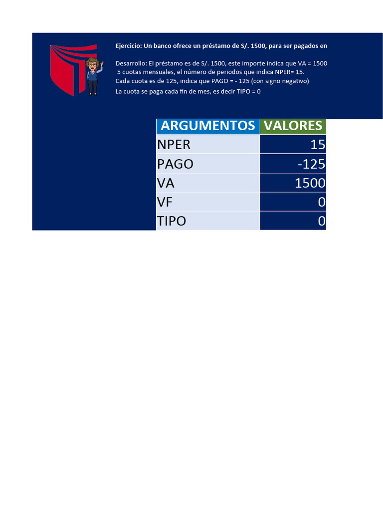Desarrollo: El préstamo es de S/. 1500, este importe indica que VA = 1500.